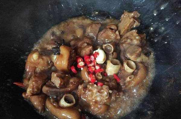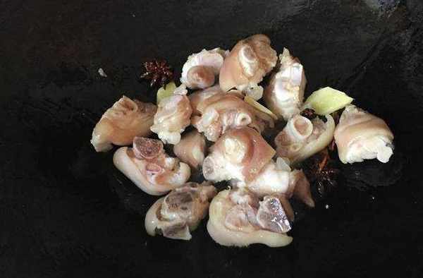 材料:豬腳500克,生薑1塊,小辣椒5個,八角3個,冰糖2小塊,大蒜8瓣,蔥2根,桂皮3小片,醬油1匙,生抽2匙,料酒2匙,鹽適量。