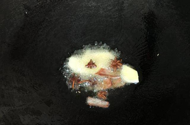 3、炒鍋放油燒熱,放入八角、桂皮、薑片爆香(油溫不要太高,以免炒糊瞭)。