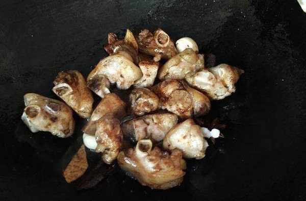 4、迅速放入豬腳,快速翻炒,煸炒至微微焦黃的程度後加料酒翻炒均勻。