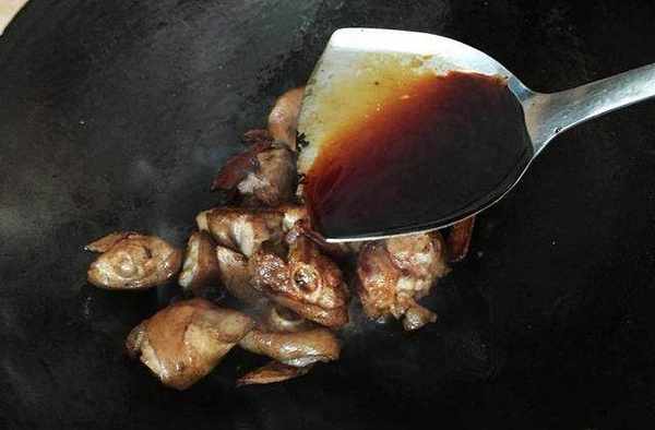5、然後緊接著加入醬油快速翻炒上色,這時候放的是醬油不是生抽。