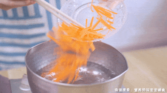 燒開水,將胡蘿卜絲放入沸水中煮小會,再將黃瓜絲也倒入焯熟,撈出控水備用;PS:胡蘿卜先放,黃瓜絲可以直接生吃,煮不煮都可以;水中可以加一勺芥花籽油,可減少營養流失;