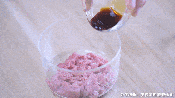 牛肉泥中加入適量的低鈉醬油和薑片,攪拌均勻,醃制15分鐘;PS:1歲內直接用蔥薑水代替低鈉醬油,1歲以上少量加點低鈉醬油,切點薑絲一起醃制祛腥;
