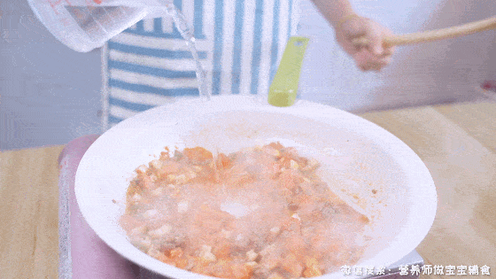 加入適量的清水,煮沸後加入水淀粉;PS:這裡的水淀粉是用玉米淀粉和山藥粉加適量清水調制而成,既增加營養又可使醬汁更加地濃稠~