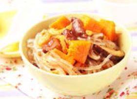 原料:南瓜肉270克,水發香菇75克,水發綠豆粉150克,蝦米35克,薑片少許