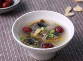 原料:鱔魚肉350克,鱔魚骨100克,黃芪、紅棗、薑片、蒜苗各少許