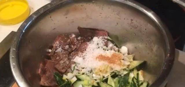 第三步:將切好的黃瓜和蔥花末放入盛腱子肉的盆中,然後放入白糖2勺和適量的牛肉粉來回竄拌均勻。