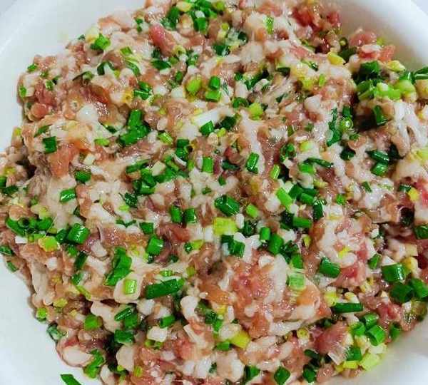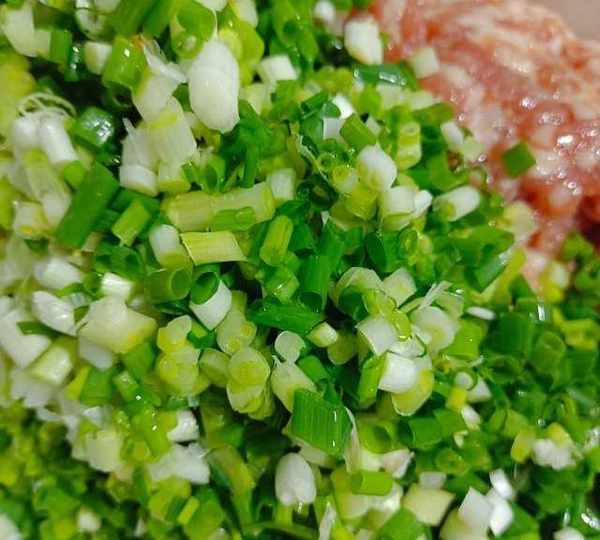 第6步、調好肉餡再加蔥花。