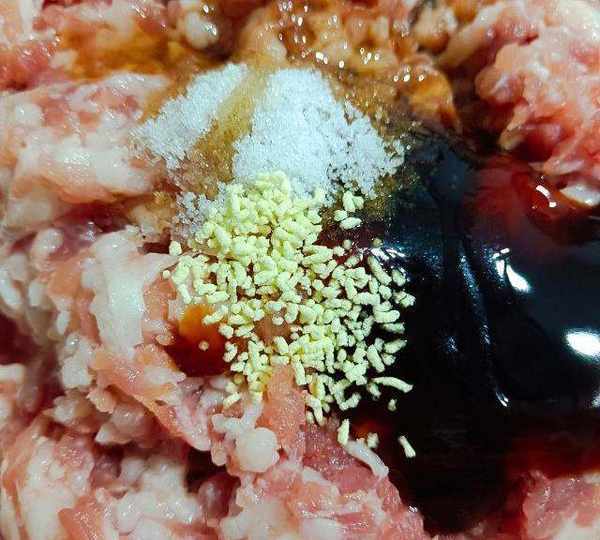 第4步、肉餡加入適量的耗油,生抽,雞精,鹽,芝麻油。