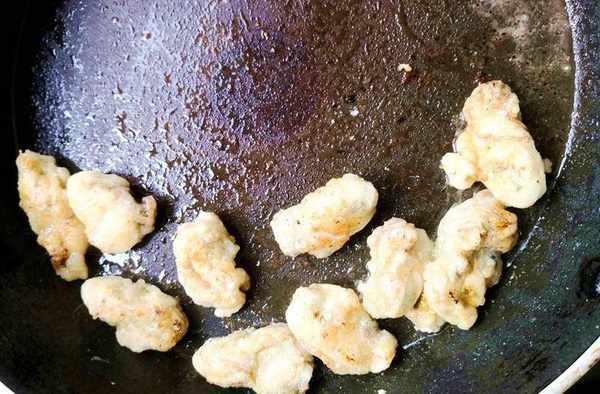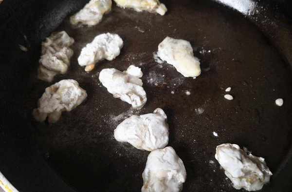 4. 平底鍋裡放入食用油,把裹瞭淀粉的海蠣子放進去煎,註意要小火慢煎,