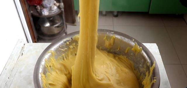 3、下來開始和面,和面盆裡加入黃米面,北方人炸粘糕用的就是這種黃米面。黃米面,也稱為糕面,是北方特有的谷物黍(shǔ)子去皮後磨成的面粉。它的顏色淡黃,煮熟後很黏,在北方主要用來做一些傳統的糕。