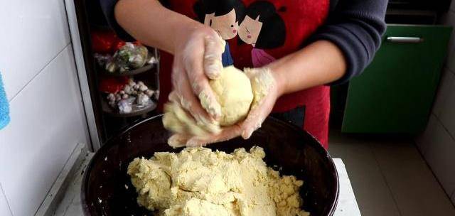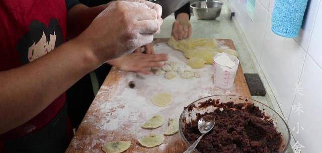 用搟面杖搟皮,把糕的餡包進去,就像包餃子一樣包好。