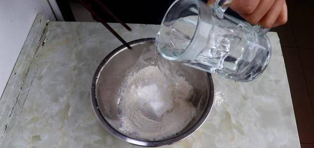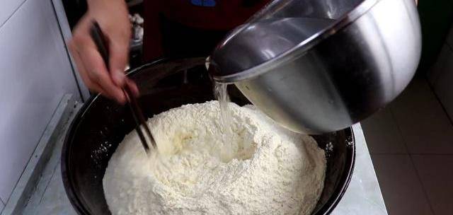 然後加入溫水來和面,邊加入水,邊用筷子攪拌,攪到裡面沒有幹面粉為止,能用手團成團就行。