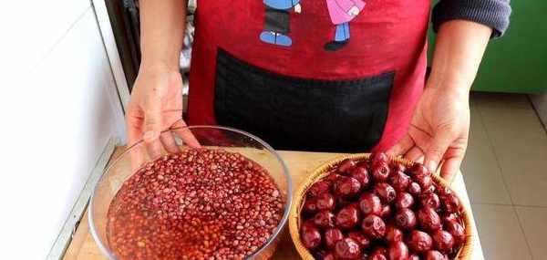 1、先準備做糕的餡,我準備瞭紅豆和洗幹凈的紅棗,這個紅豆我已經提前泡瞭一個晚上瞭。