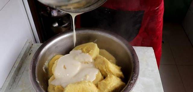 往案板上撒些幹的面粉,把攪勻的黃米面倒在案板上