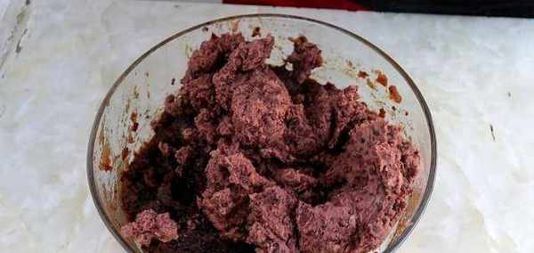 3、紅豆煮熟後,把紅豆也碾碎,然後和棗泥倒一起攪拌均勻