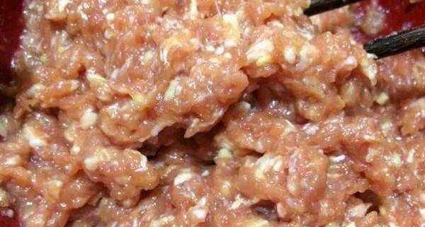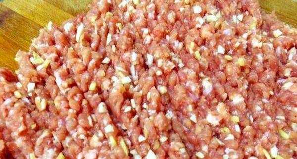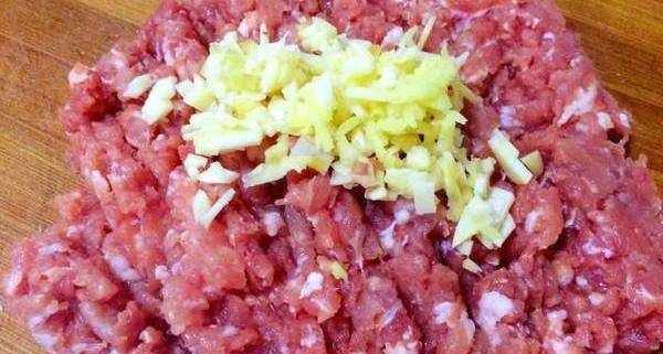 6.再講肉剁瞭幾分鐘後放入切好的薑蒜末,在一起剁
