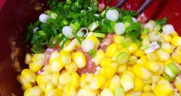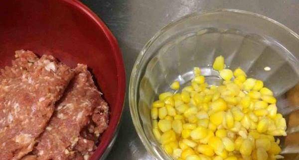 豬前腿肉400克、玉米粒40克、面粉400克、料酒一勺、水40克、生抽一勺、雞蛋清一個、薑三片、蒜兩顆、小蔥一根、精鹽半勺、芝麻油兩勺、胡椒粉1克