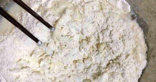 2.放入水,用筷子攪拌,在沒有多餘的散粉的時候就可以瞭。再用手揉面,