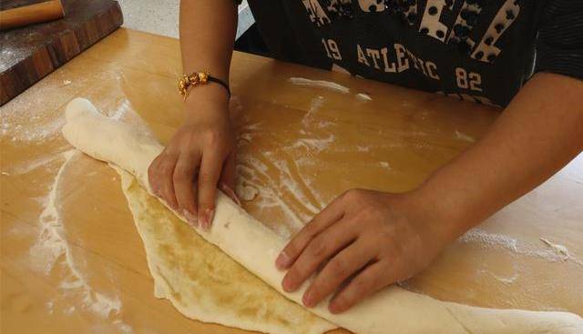 10.油酥攪拌一下,倒在面皮上,用手抹均勻,從下往上卷起,一邊拉一邊卷,這樣做更加緊實,層次更豐富。
