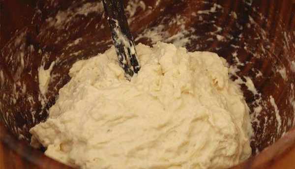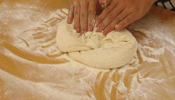 8.案板上多放一些面粉,把面糊倒在面粉上面,利用幹面粉,把面糊整理成圓形,按薄。