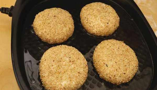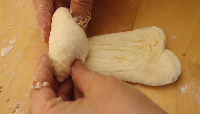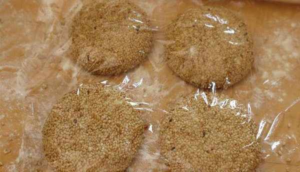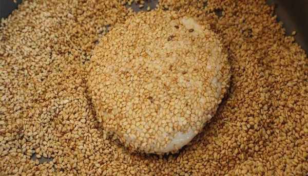 15.再反正面都蘸滿芝麻,按壓使芝麻蘸牢固,再抖掉多餘的芝麻。
