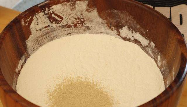 2.碗中放入400克面粉,放入4克酵母。