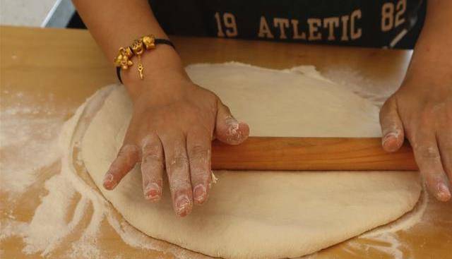 9.再多撒一些幹面粉,搟成半厘米厚的面餅。