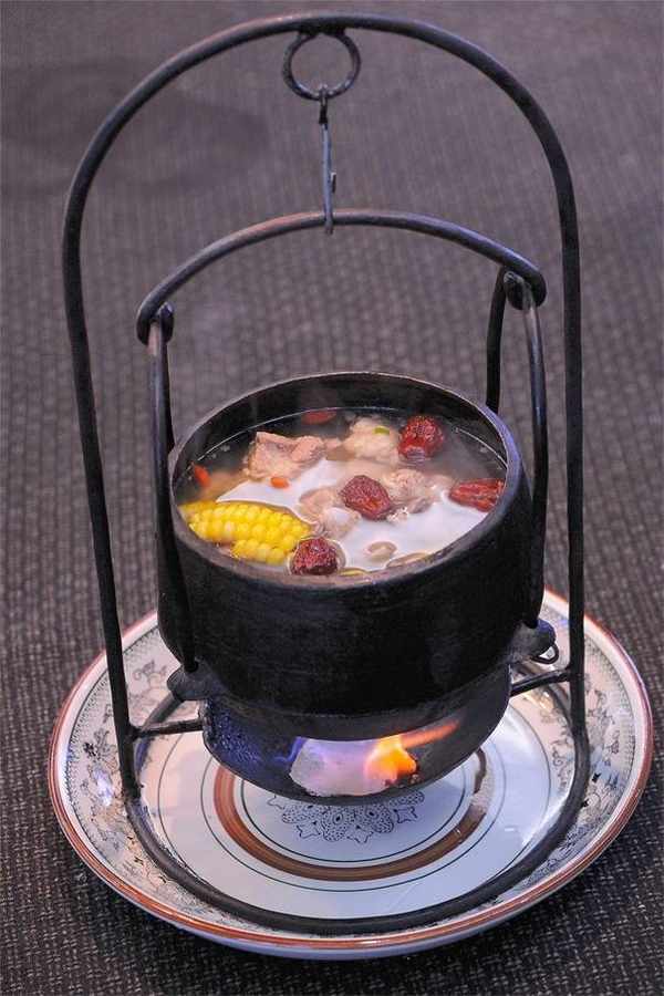 除食材講究外,輔料以川穹、細辛、伸筋草等藥入湯,弧形罐底和柴火的旺盛,使得食物受熱立體化,,肉熟透而不爛,色麥黃而不偏(