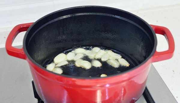 4.然後把煎雞翅出的油,倒入燉鍋中,小火,放入蒜片炒香。