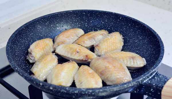 3.炒鍋中放少許油,將焯水後的雞翅放入,煎至兩面金黃。將雞翅表皮的油煎出,並且鎖住內部的肉汁,然後再燒燉,肉香味才會更加豐富濃鬱。