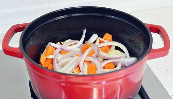5.再放入胡蘿卜和洋蔥,轉大火,翻炒至洋蔥稍軟塌,將食材的香味炒出。