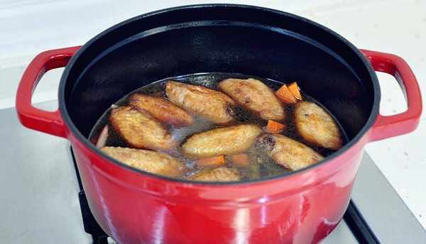 6.然後倒入紅葡萄酒,加入鹽,拌勻煮開後再加入雞翅。