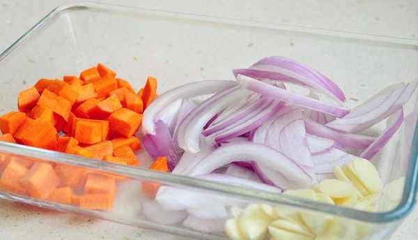 做法:1.大蒜切片,胡蘿卜切丁,洋蔥切片條。