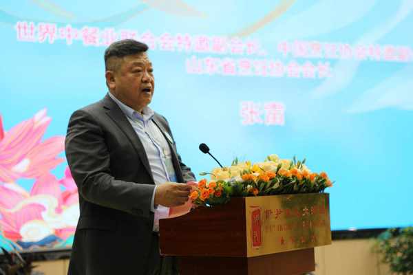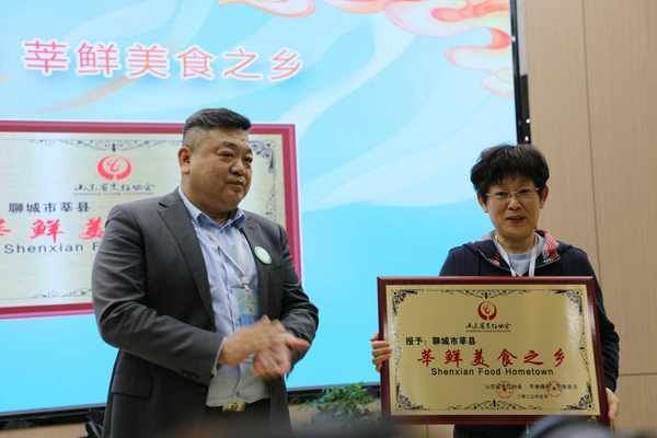 活動現場,山東省烹飪協會會長張雷為莘縣頒授“莘鮮美食之鄉”牌匾。