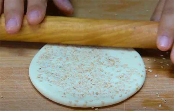 5.表面刷一些水,撒一些白芝麻,用搟面杖搟開,搟的時候一定要註意整個力度,均勻一些。