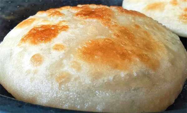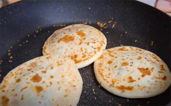 6.平底鍋中小火預熱好刷油,放餅胚,蓋上蓋子烙,烙到餅胚底面變色定型,表面刷一些油,翻個面,再烙一會兒出鍋。