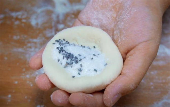 4.把面劑揉圓揉勻,直接捏成小圓餅的形狀,中間包上糖餡,收口處收緊,胚子就做好瞭。