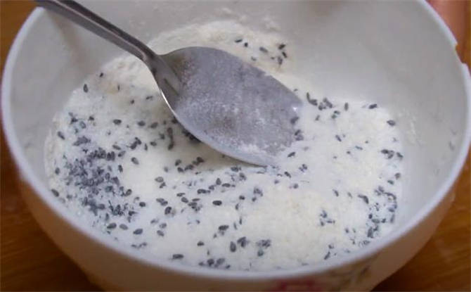 2.這個時間咱們調個糖餡,放一些白糖,放一些黑芝麻,少來一些面粉,用勺子攪勻,糖餡就調好瞭。