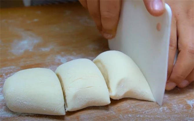 3.現在這個面團已經餳好瞭,案板上撒一些幹粉,揉兩下揉勻,揉好之後滾成長條,再切成小面劑。