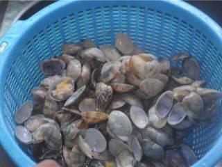 1、花蛤放入清水裡,加入少許鹽養半天。這一步是為瞭讓花蛤吐沙子,否則影響口感哦~
