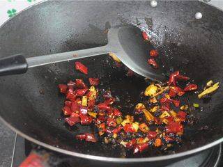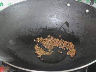 3、油鍋燒熱後,熱鍋油溫後將花椒炒出香味,花椒味出來後再將花椒撈出扔掉,下薑蒜炒出香味加入豆豉。