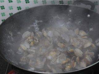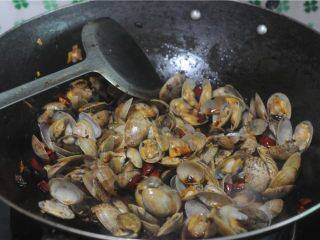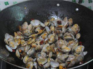 4、翻炒幾下倒入辣椒炒香(不能吃辣的這裡就可以不放辣椒哦),翻炒幾下將花蛤倒進去翻炒中途加入料酒、生抽、蠔油炒勻蓋上鍋蓋燜2分鐘左右