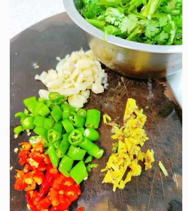 5.薑蒜也切碎,青紅辣椒切小段,備好
