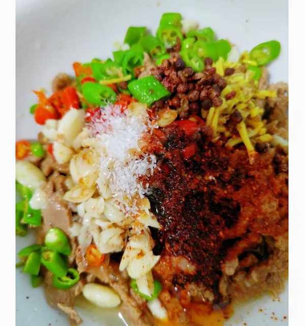 8.碗中加入備好的薑蒜,青紅辣椒,辣椒粉,幾粒幹花椒