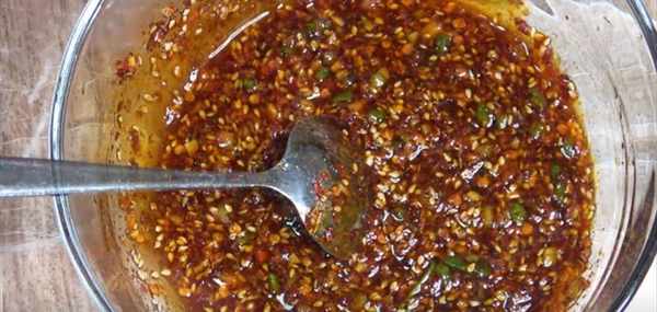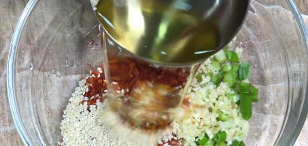 6、碗中放入蔥蒜末,再2勺辣椒粉,1勺白芝麻,倒入滾燙的熱油激發香味。
