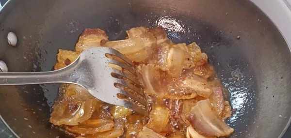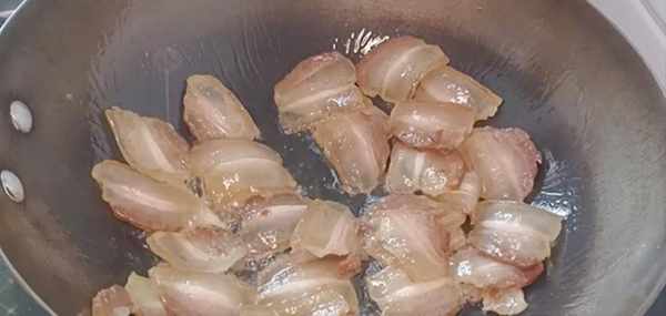 4、鍋熱倒入花生油,放入臘肉煸炒,炒出油脂,炒到微微焦黃,差不多就可以瞭。