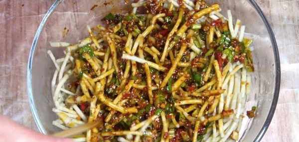 10、撈出控水,放入碗中,再倒入料汁,充分攪拌均勻,再醃制15分鐘。