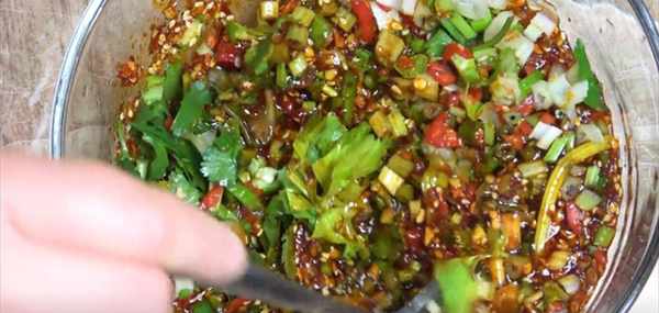 8、再把辣椒、芹菜、香菜倒進來,繼續攪拌均勻,這碗料汁就算是做好瞭。