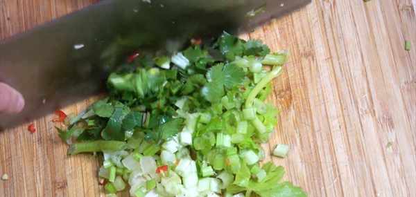 5、小芹菜切成小塊備用,做涼菜加一點小芹菜,味道會更香,再切點香菜。