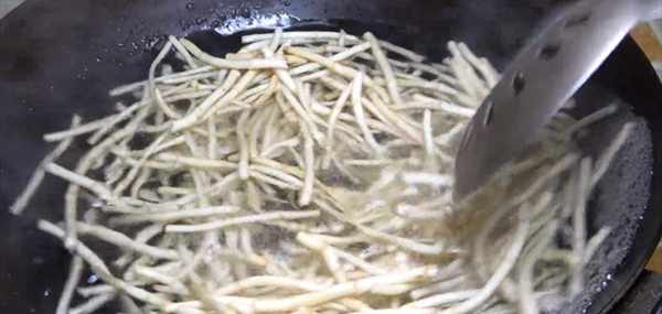 9、鍋中水燒開,放入折耳根,大約焯水20秒,不能煮太久,不然會煮軟。